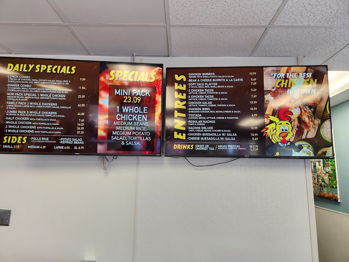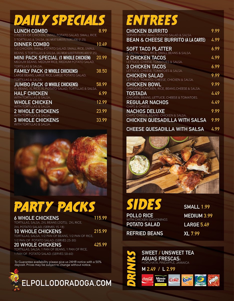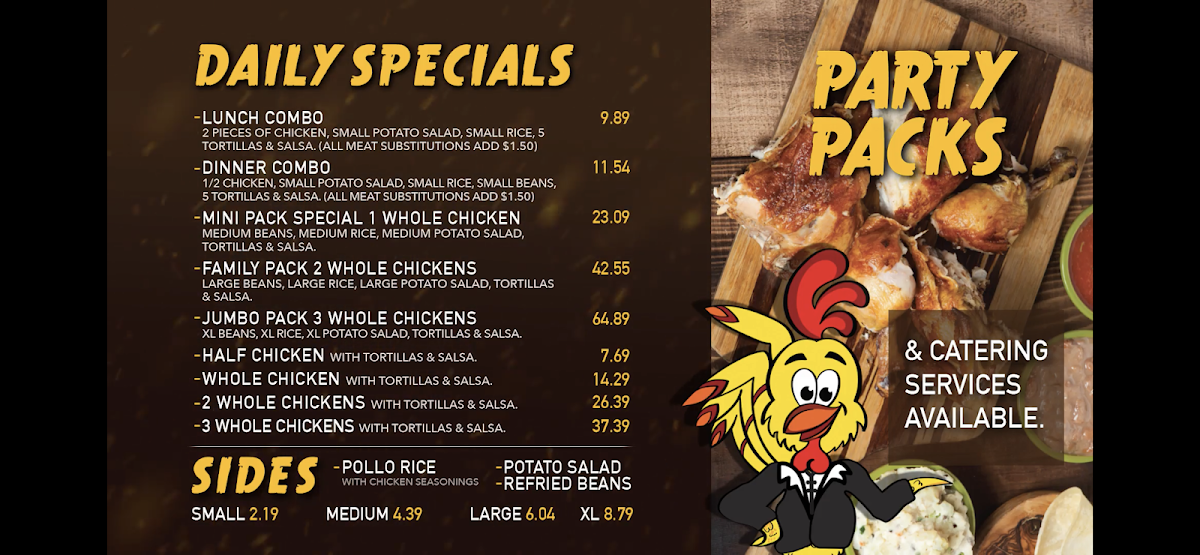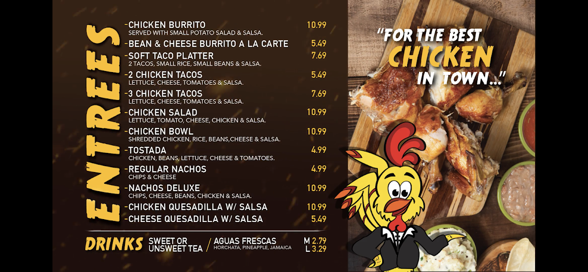 Overall, the menu at El Pollo Dorado delivers a satisfying, no-frills focus on classic, comforting flavors that highlight their specialty in rotisserie-style cooking. The Rotisserie Chicken Beans and Potato Salad with Rice and Flour Tortillas stands out as a hearty, well-rounded option, offering tender, well-seasoned chicken paired with traditional sides that feel both generous and authentic. Meanwhile, the Chicken Quesadilla with Salsa provides a simpler yet equally enjoyable choice, with its crisp tortilla and flavorful filling complemented by a fresh, zesty salsa. Together, these dishes reflect a menu that prioritizes bold, familiar tastes and solid portion sizes, making it a reliable spot for anyone craving straightforward, satisfying meals rooted in homestyle preparation.